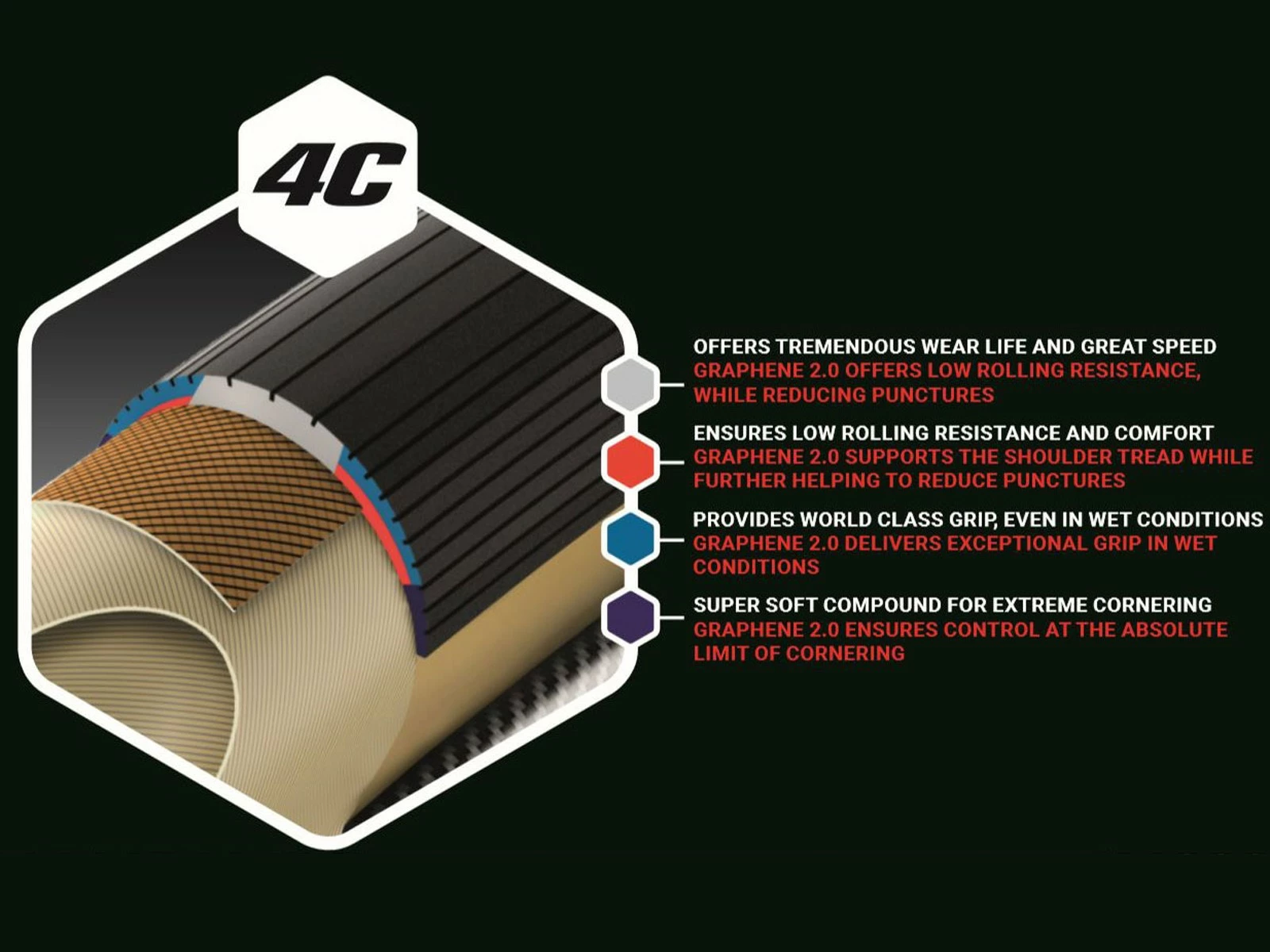 Conçu autour d’une carcasse en nylon de grande qualité, il bénéficie d’une construction combinant 3 composés dont le composé Graphène G+ Isotech pour procurer à la fois vitesse, adhérence en toutes circonstances et surtout une excellente durabilité et une résistance maximale à la crevaison et contre les déchirures.